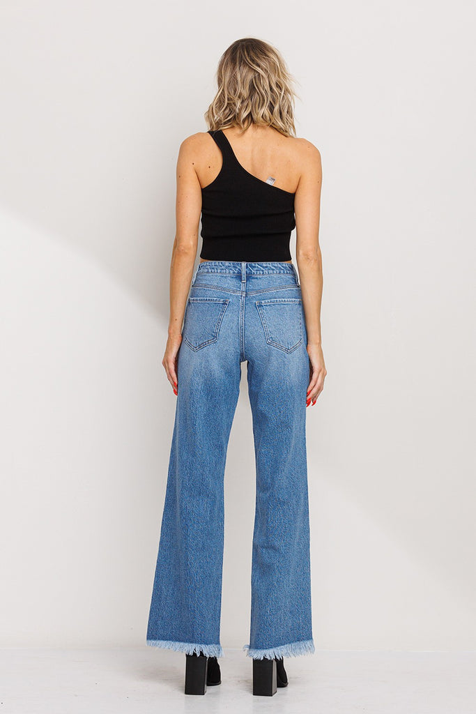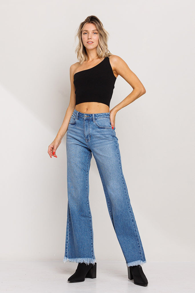These Mid rise wide leg jeans have no distressing with a fray hem and subtle