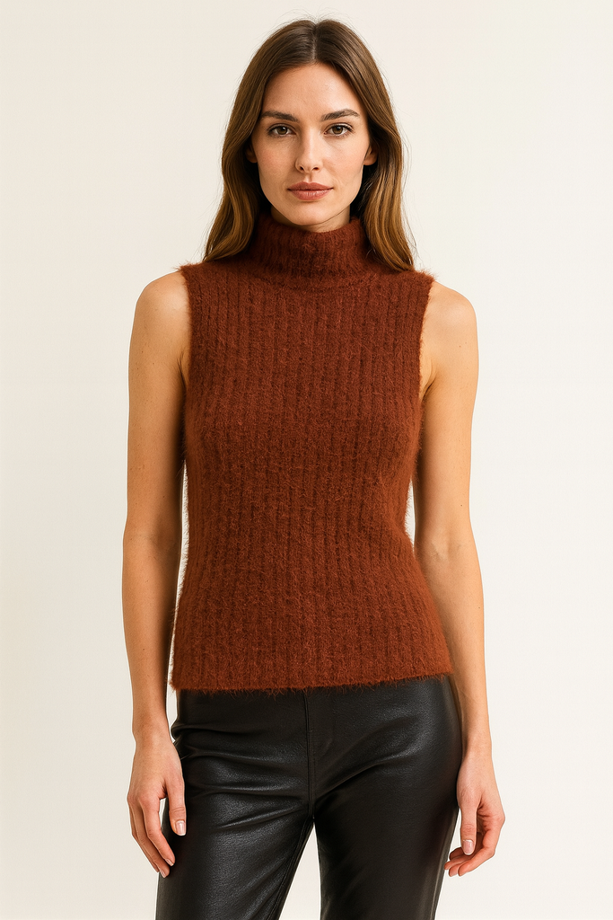 Fuzzy Ribbed Sleeveless High Neck Knit Top
