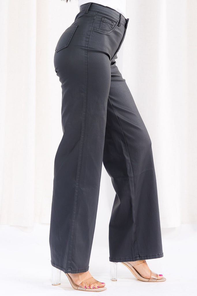 High Waist Stretch Faux Leather Coated WideLeg Pants